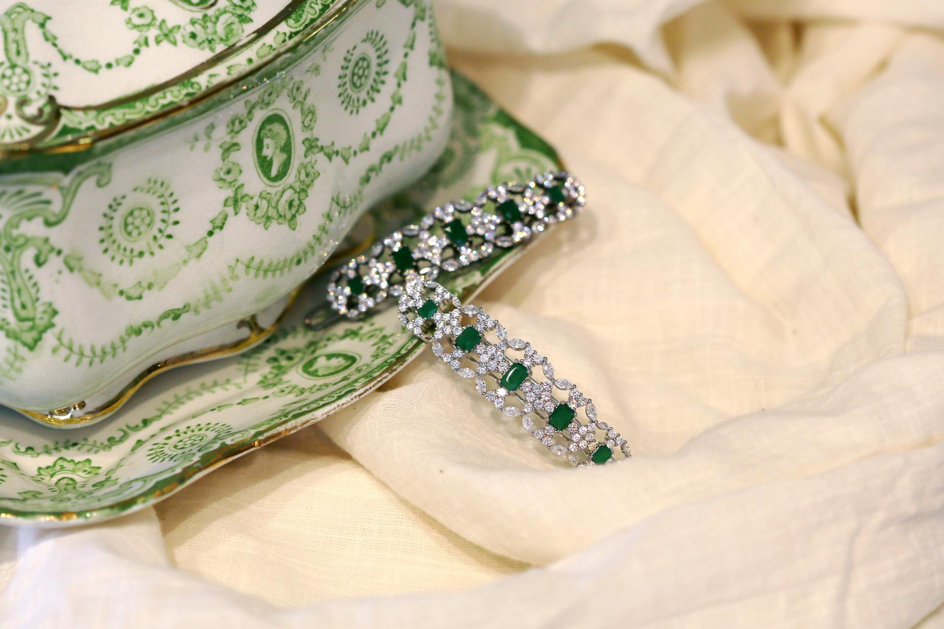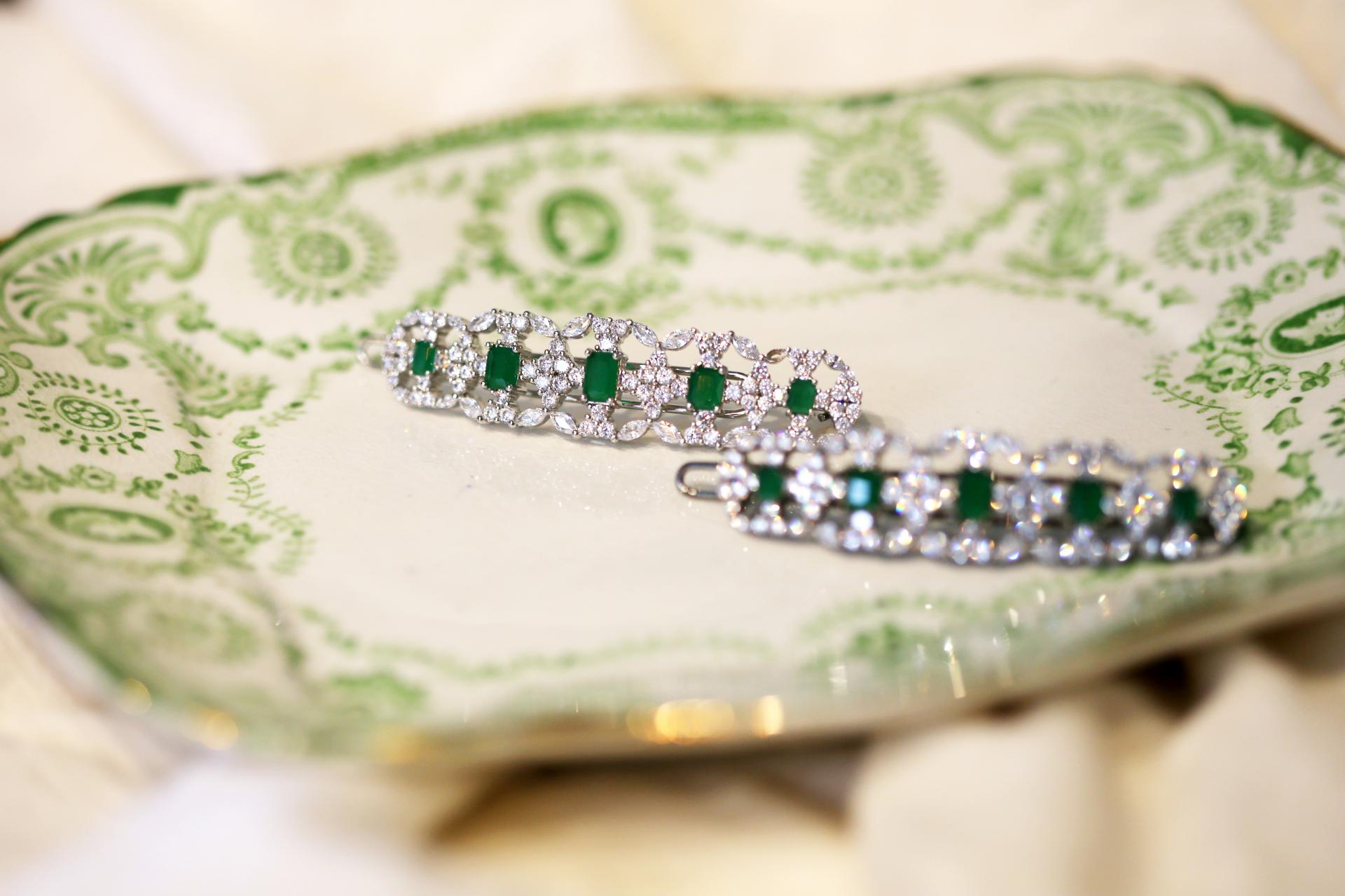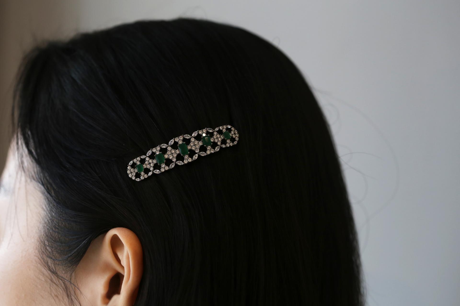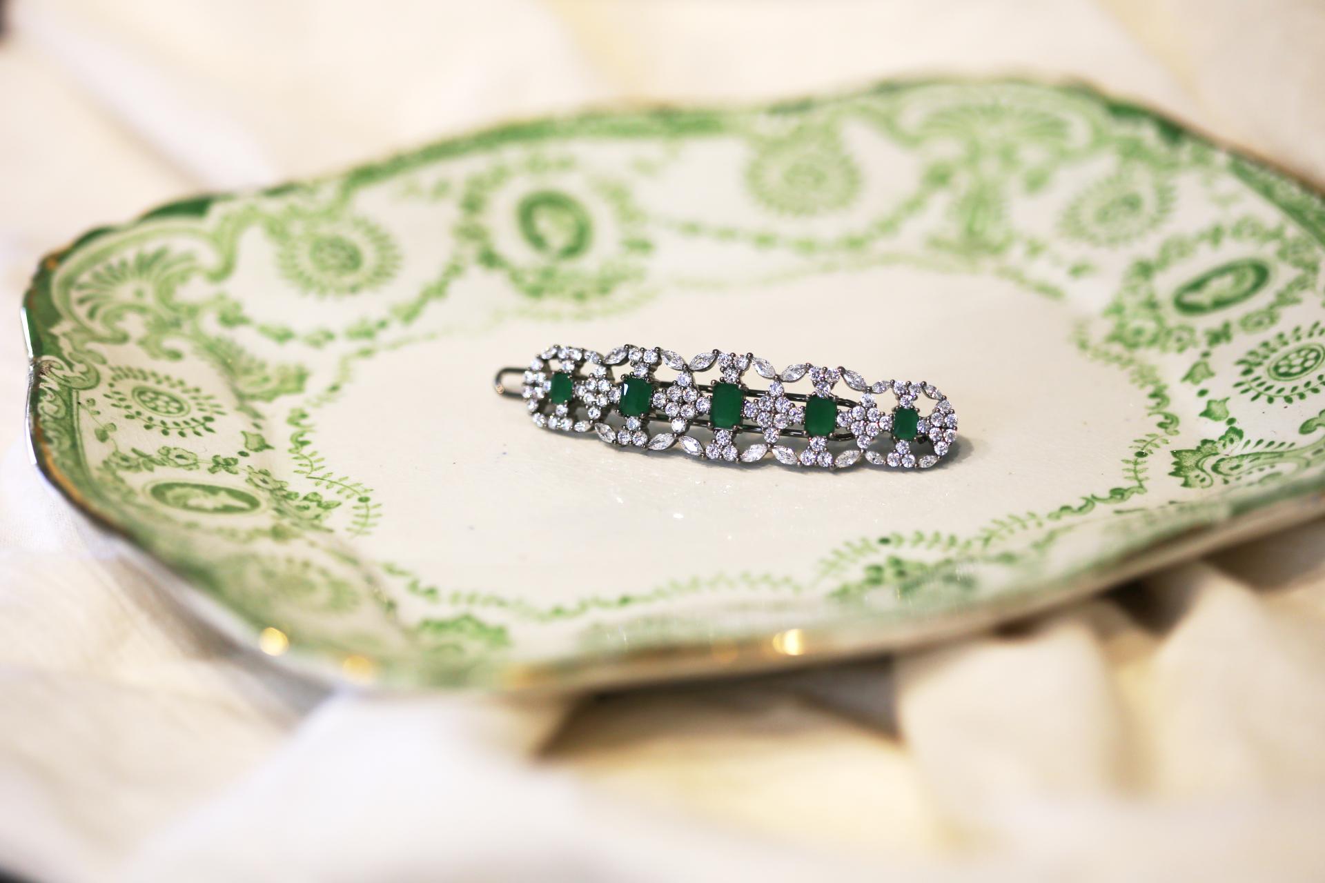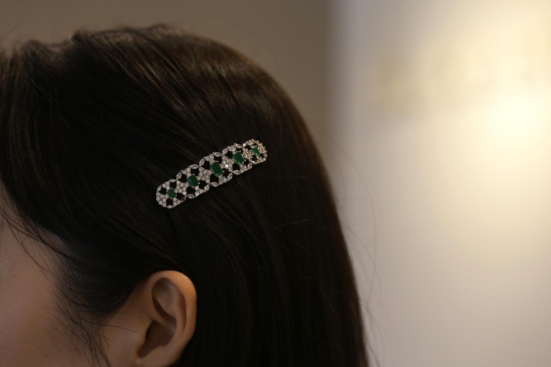 에메랄드처럼 깊고 진한 그린 컬러가 포인트가 되는, 절제된 화려함이 매력적인 디자인의 헤어핀입니다.