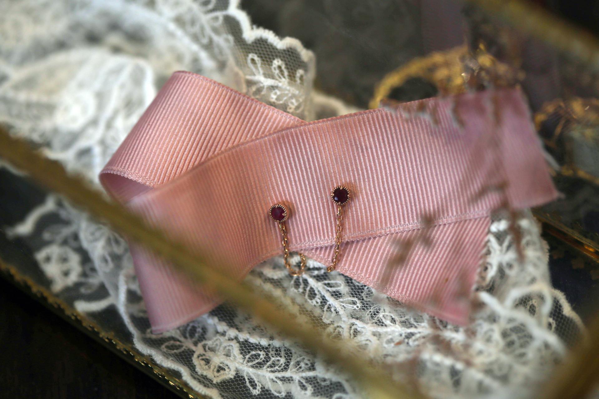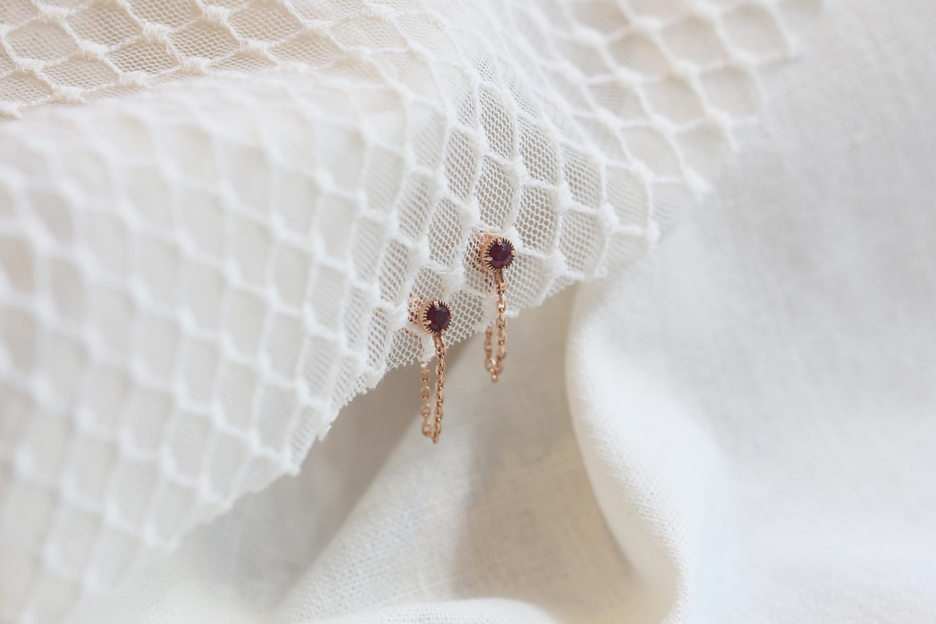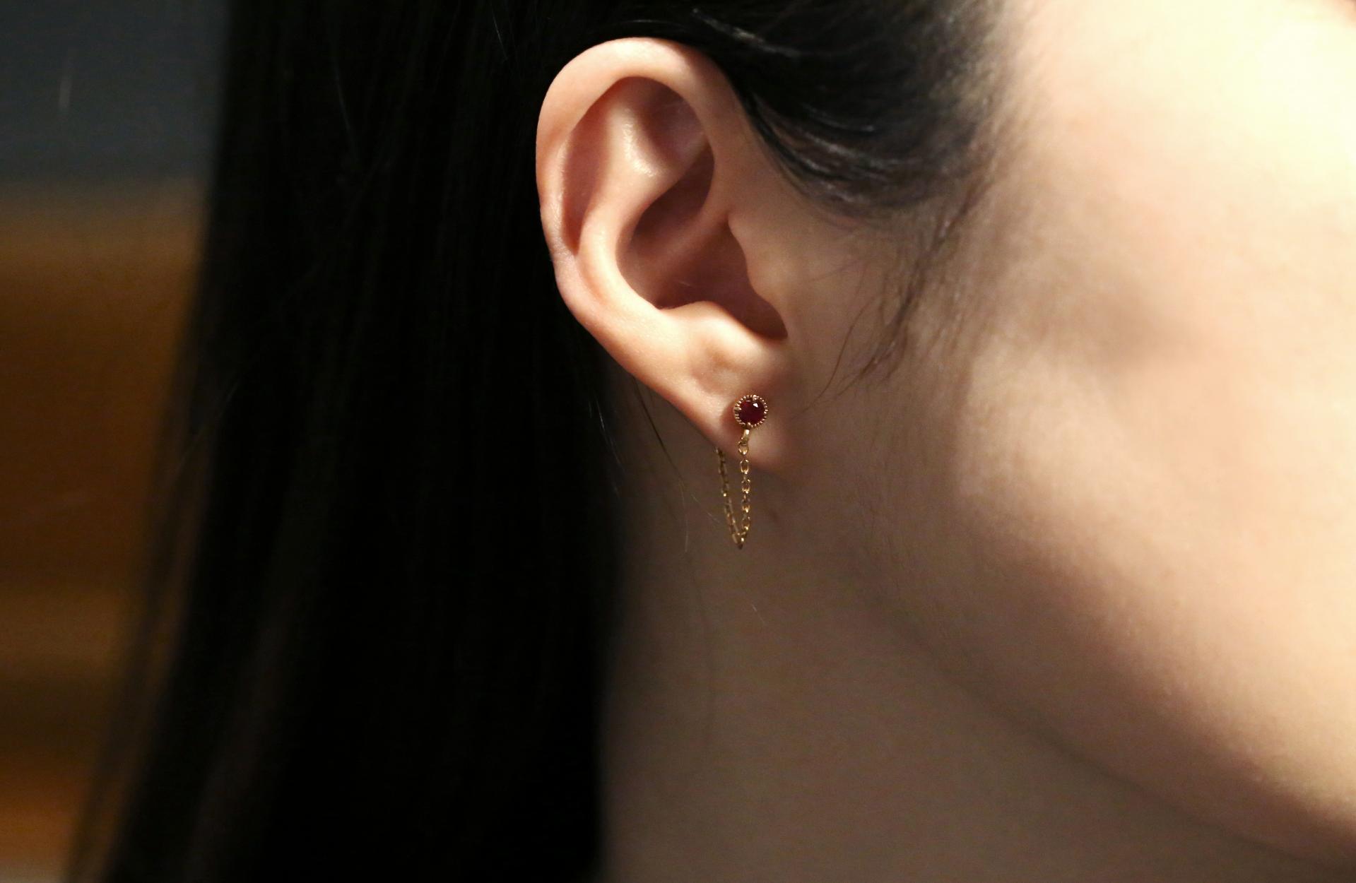새빨간 루비 0.1ct 이 세팅되어 있고 연결된 체인이 경쾌하게 움직이는 멜로디 귀걸이입니다.