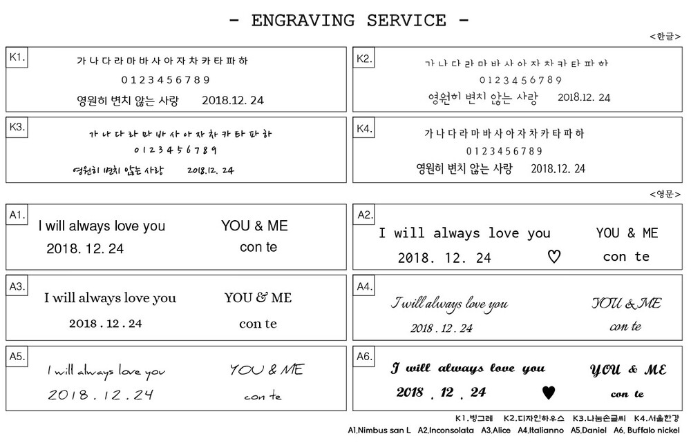 예를 들어 왼쪽에 이름이니셜 , 기억하고 싶은 날짜나 전화번호 , 메세지 등을 새길 수 있습니다.