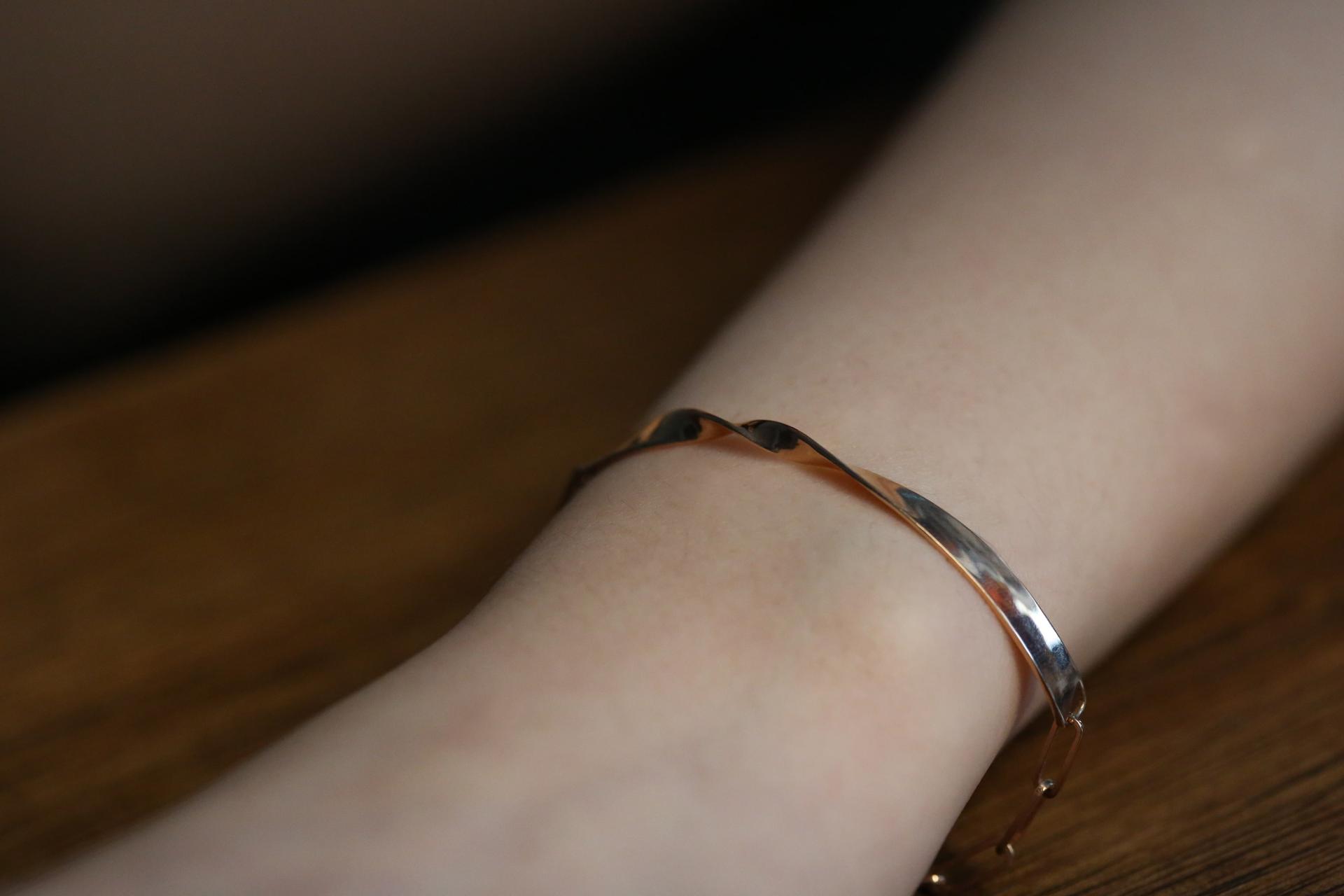 보통 흘러내리게 착용하는 체인팔찌와 다르게 리본부분이 반 뱅글 형식이라