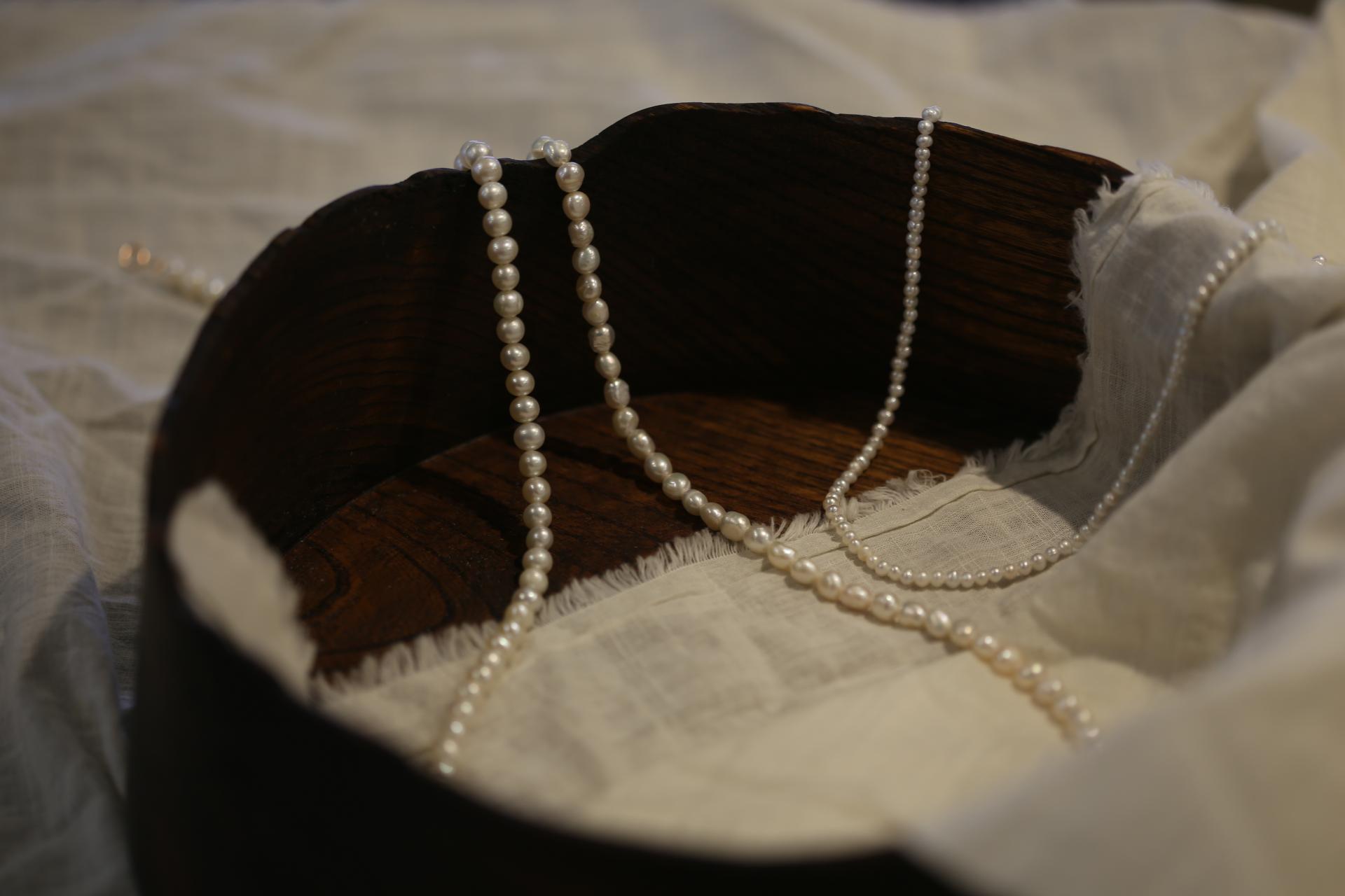 왼쪽 : 6mm 원형 기본 담수진주 // 중앙 : 6mm 바로크 담수 진주 // 오른쪽 : 3.5-4 mm 원형 기본 담수진주
