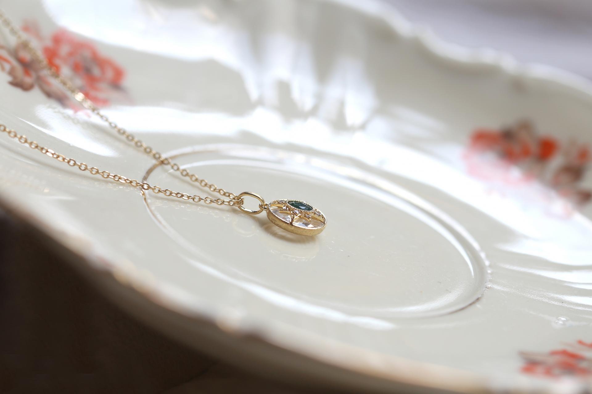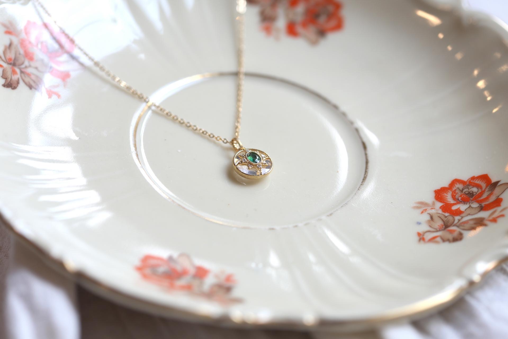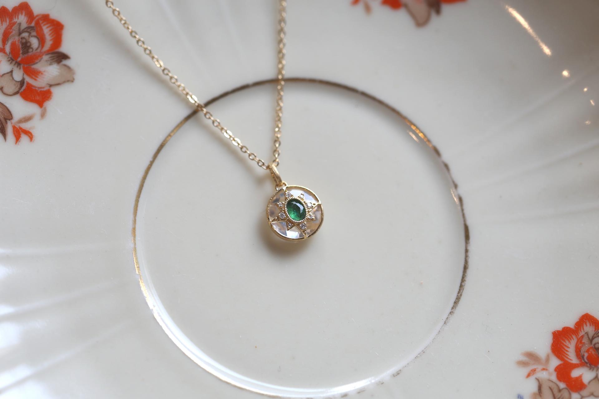 18k 옐로우 골드에 크리스탈 . 에메랄드 다이아몬드가 세팅되어 있는 세심한 세공이 돋보입니다.