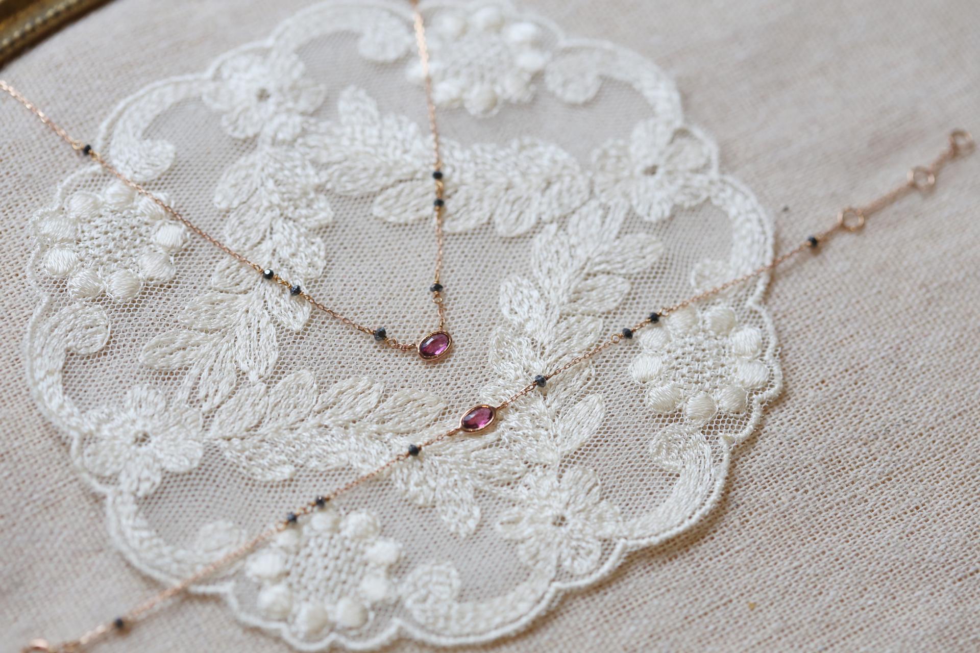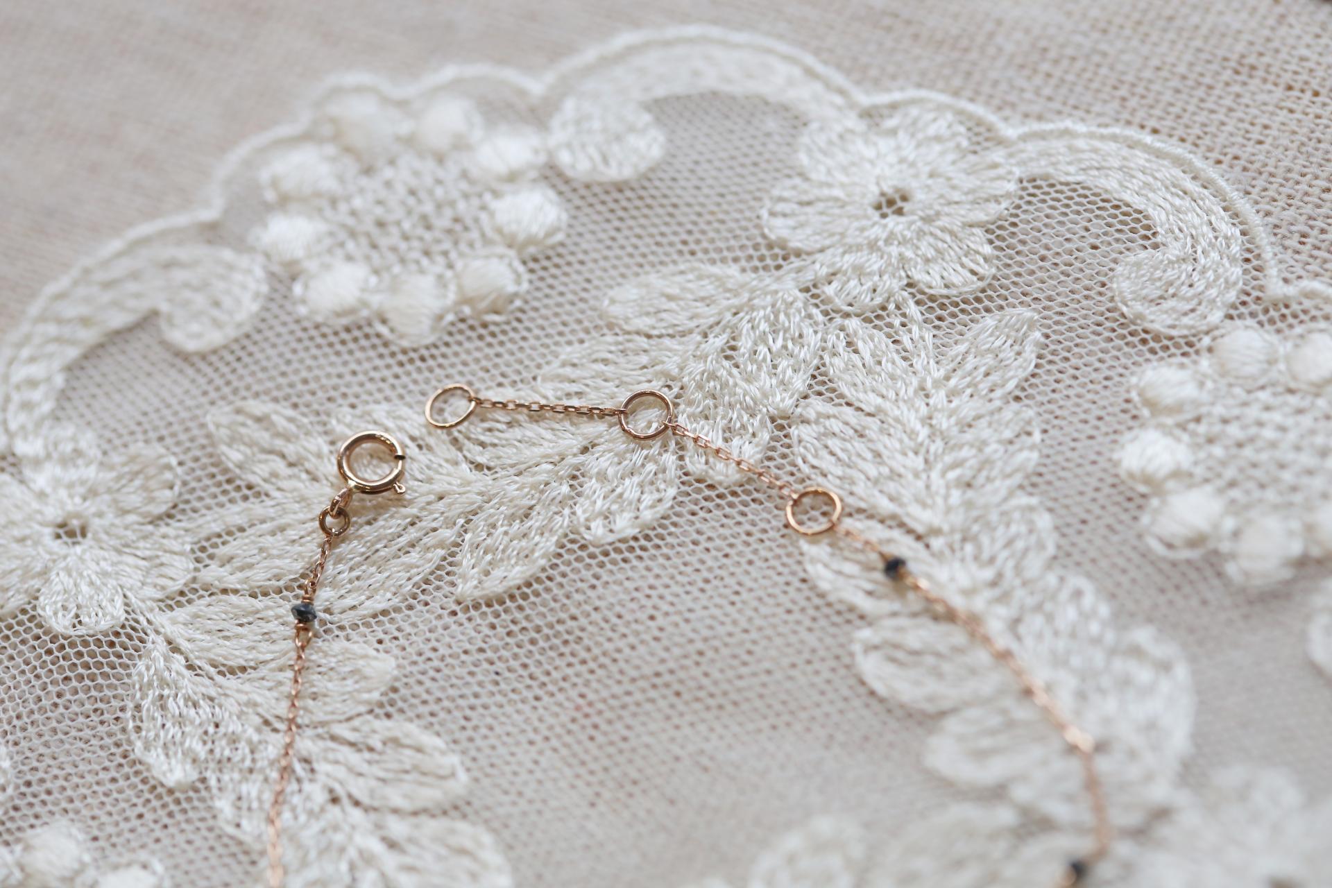 섬세한 여리한 체인 위로 반짝이는 블랙 다이아몬드가 고요한 포인트가 되어, 심플한 스타일 속에서도 감도 있는 무드를 연출합니다.