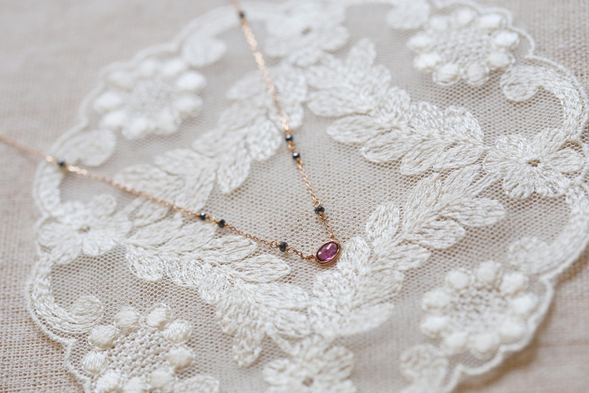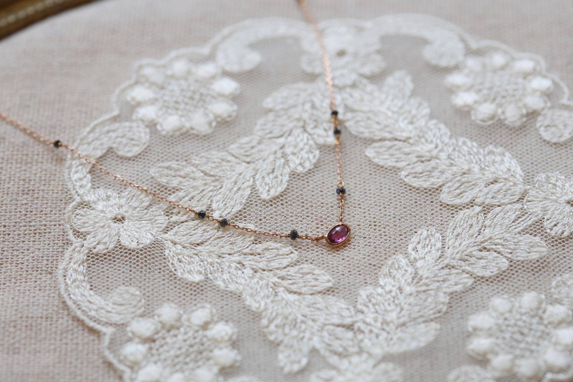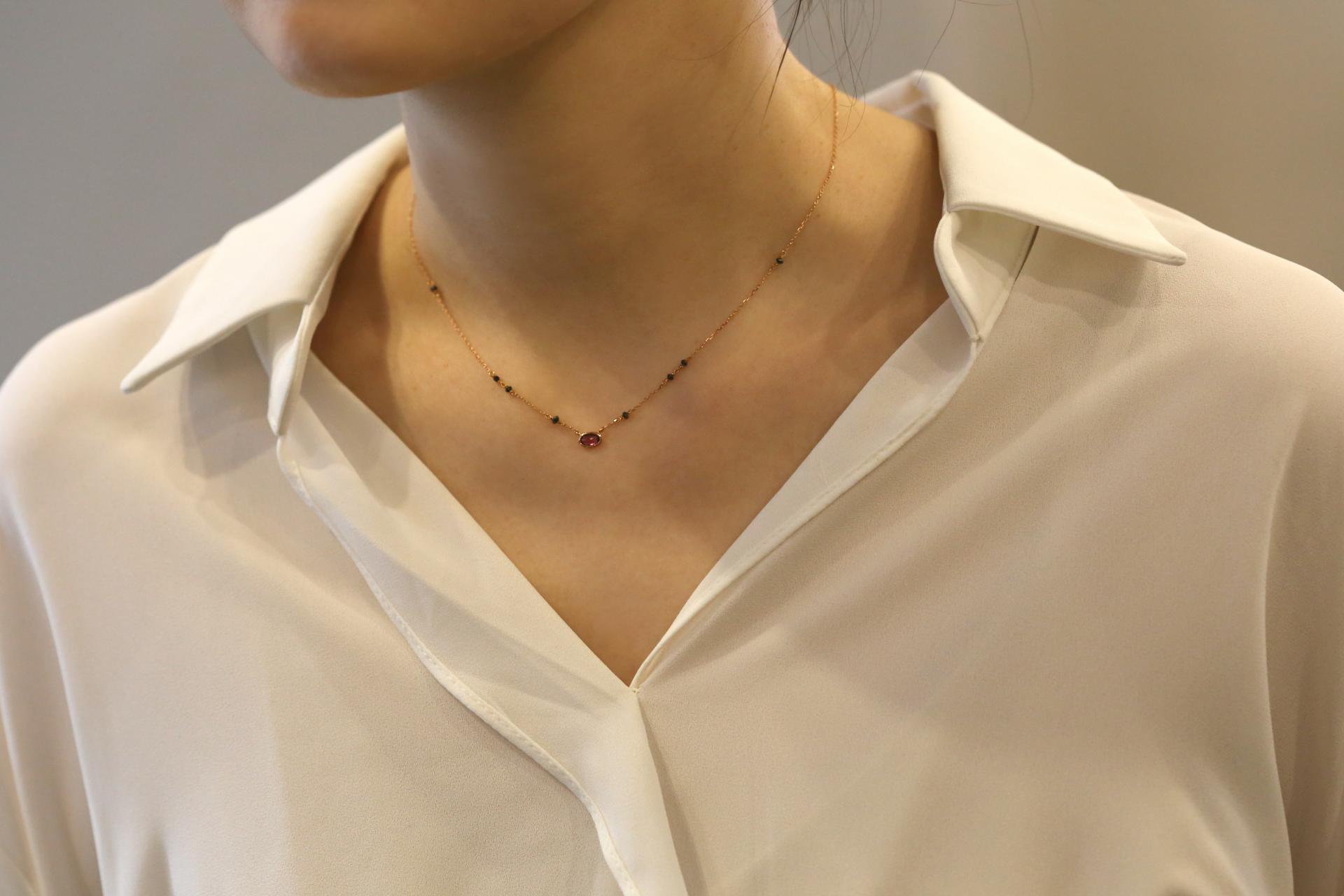 깊은 붉빛의 가넷이 메인에 세팅되고, 체인에는 블랙 다이아몬드가 은은하게 포인트를 더한 미니멀한 디자인의 목걸이입니다.