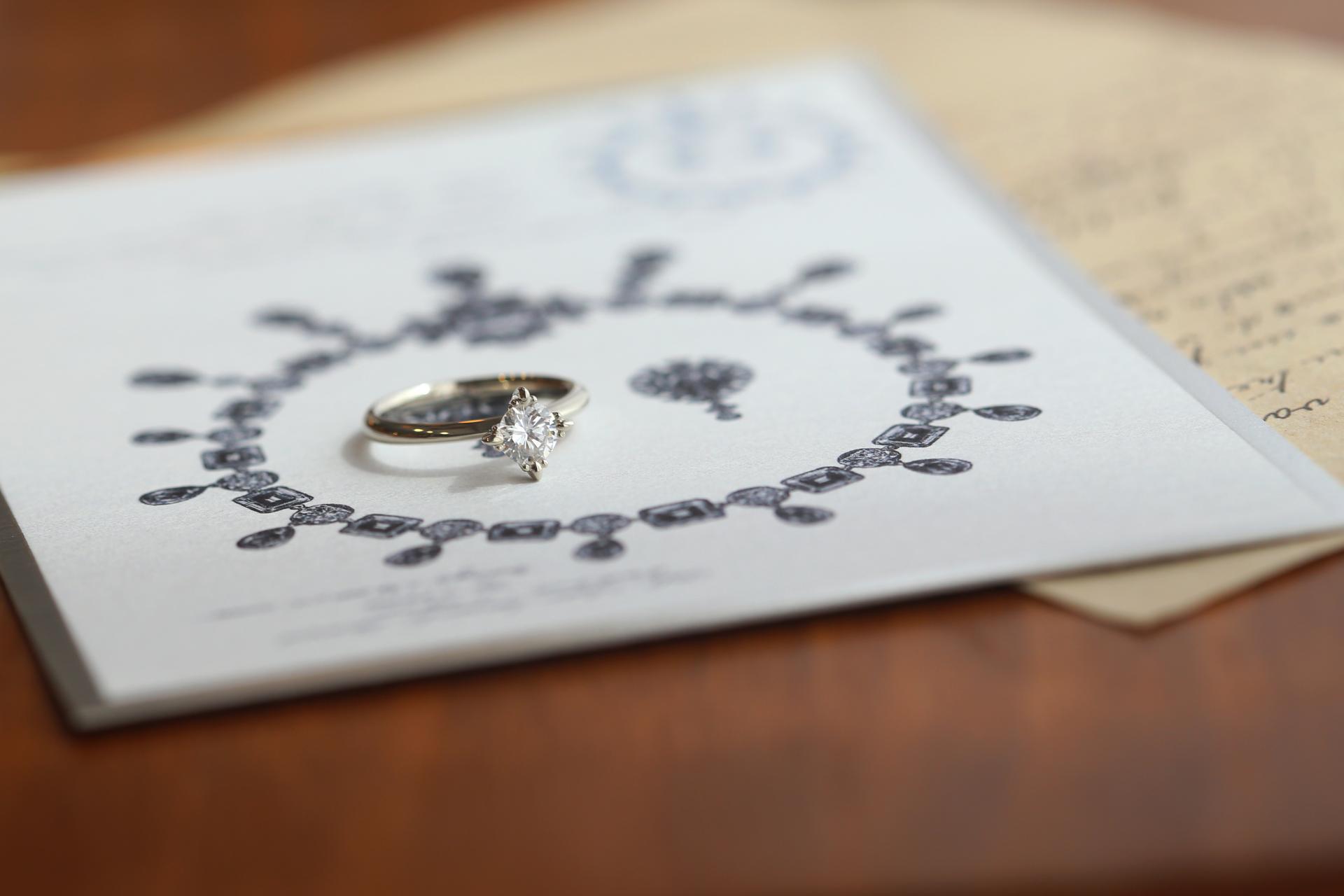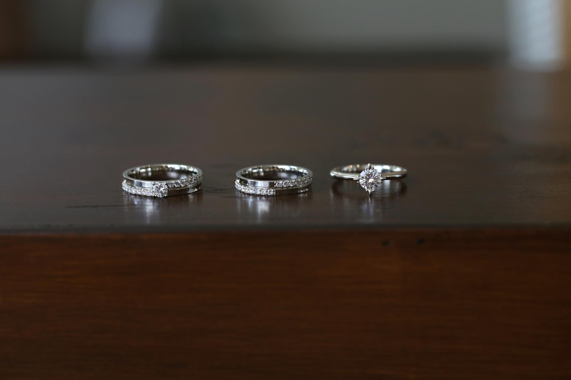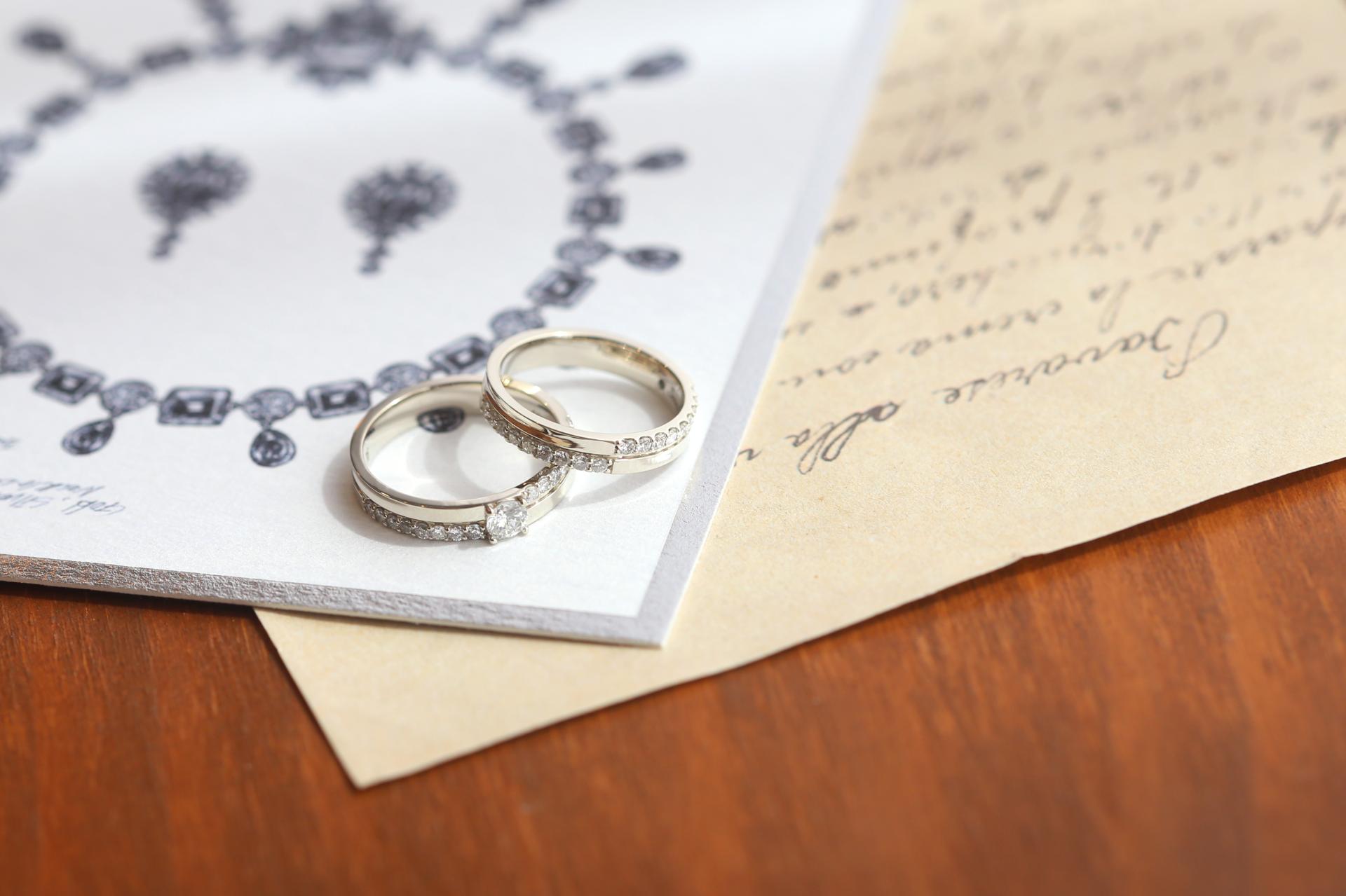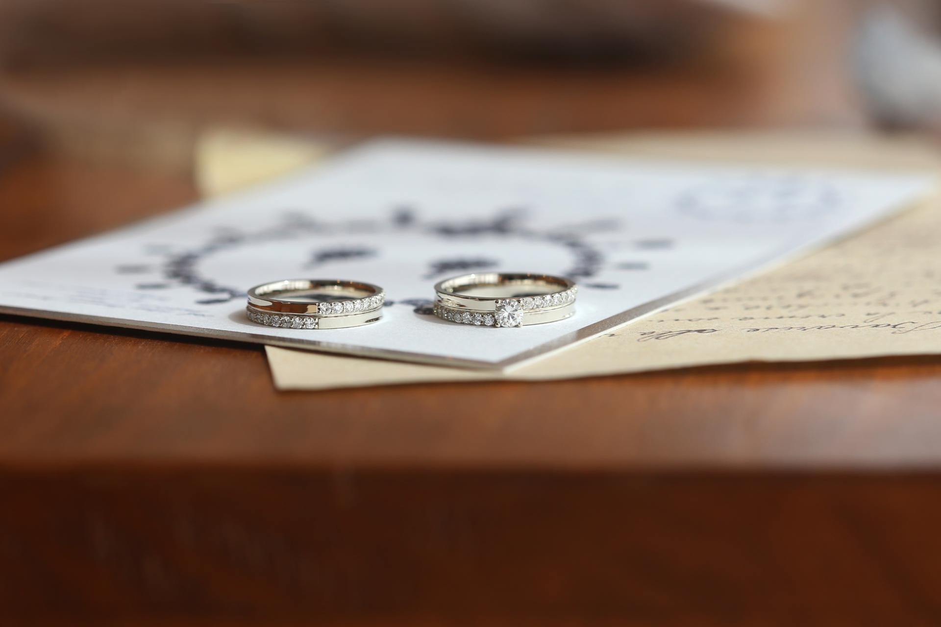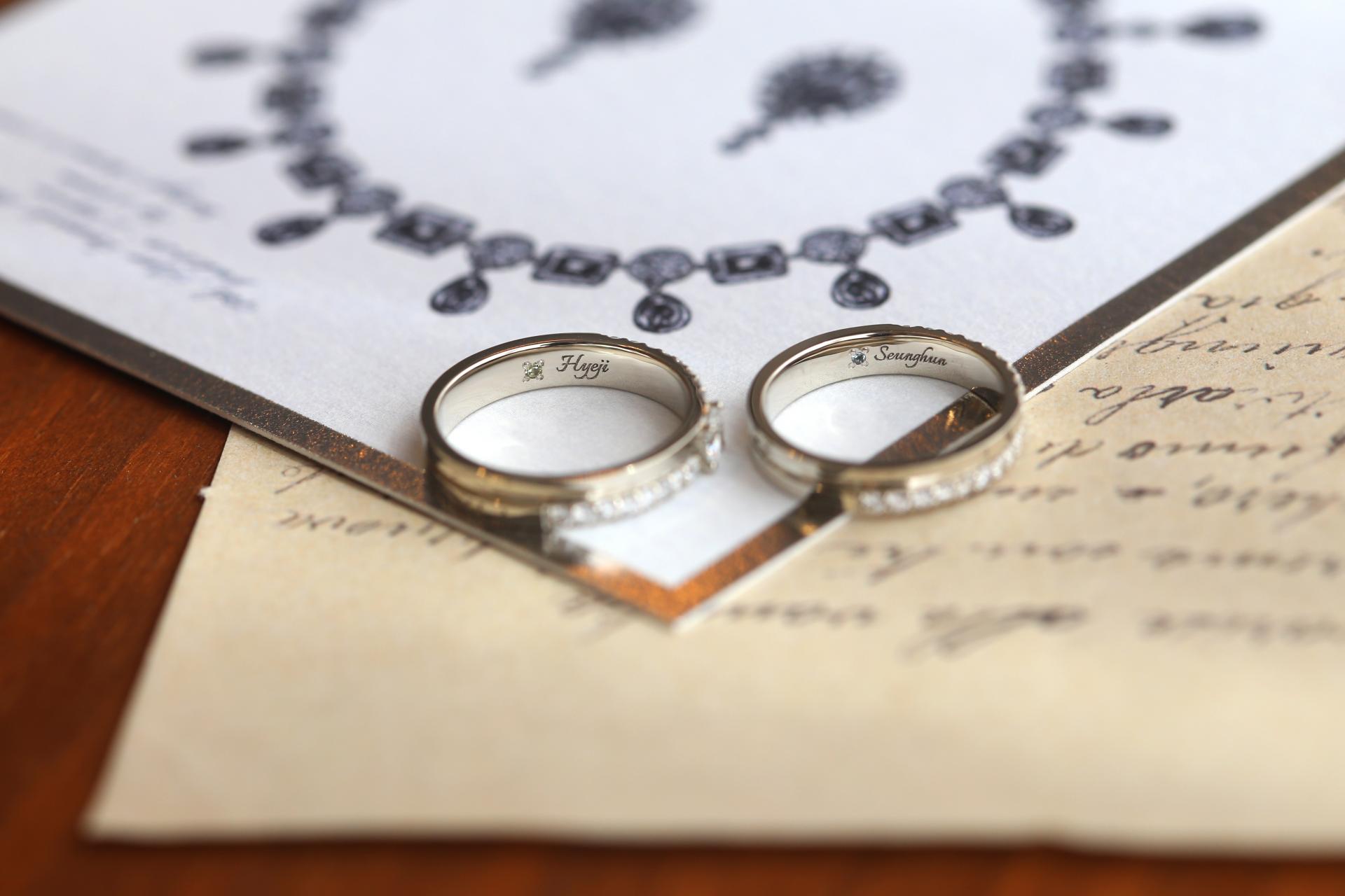 웨딩링은 벨테소로의 라플레르 디자인, 웨딩밴드는 두 분의 취향을 그대로 담아 맞춤 디자인으로 완성했습니다.