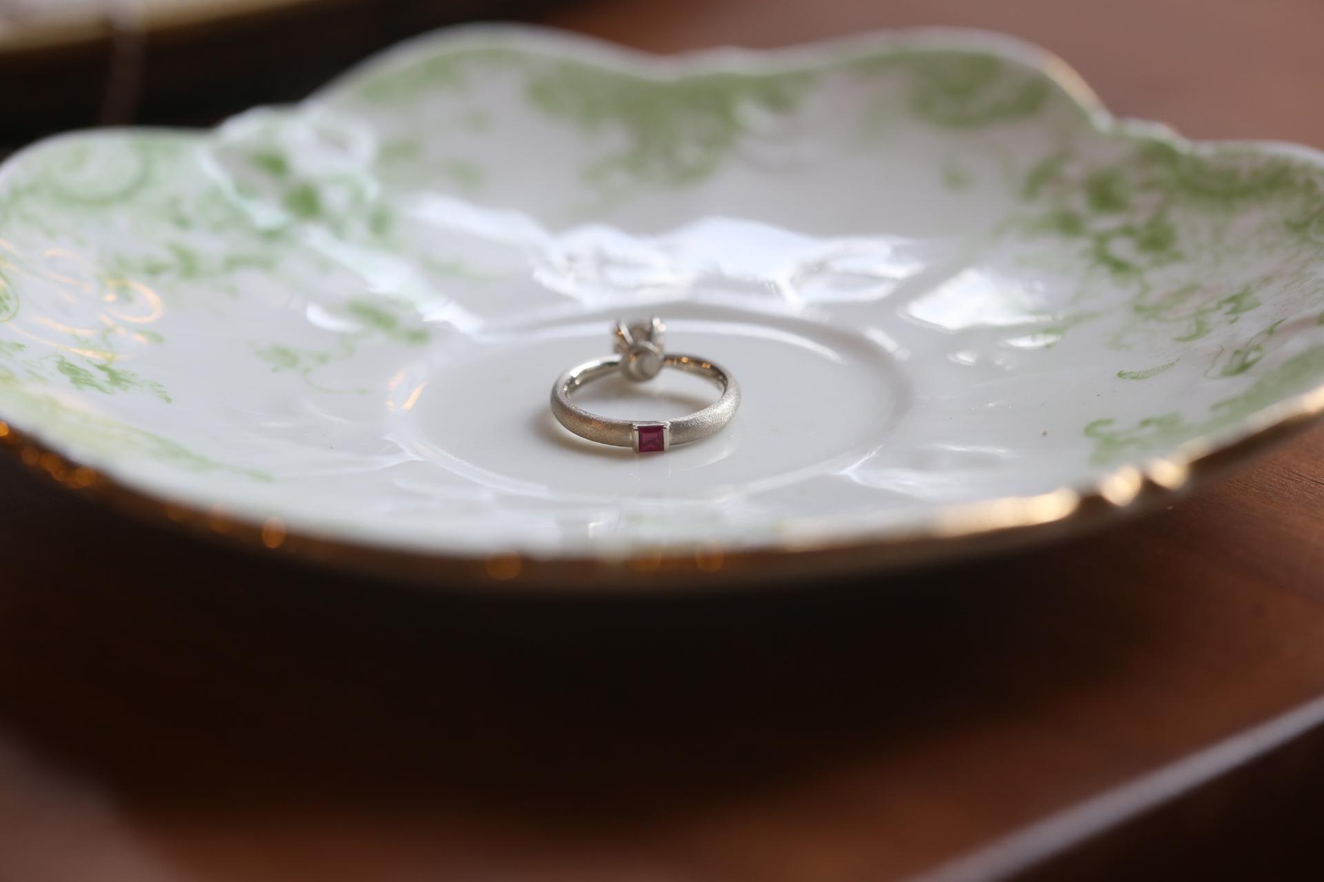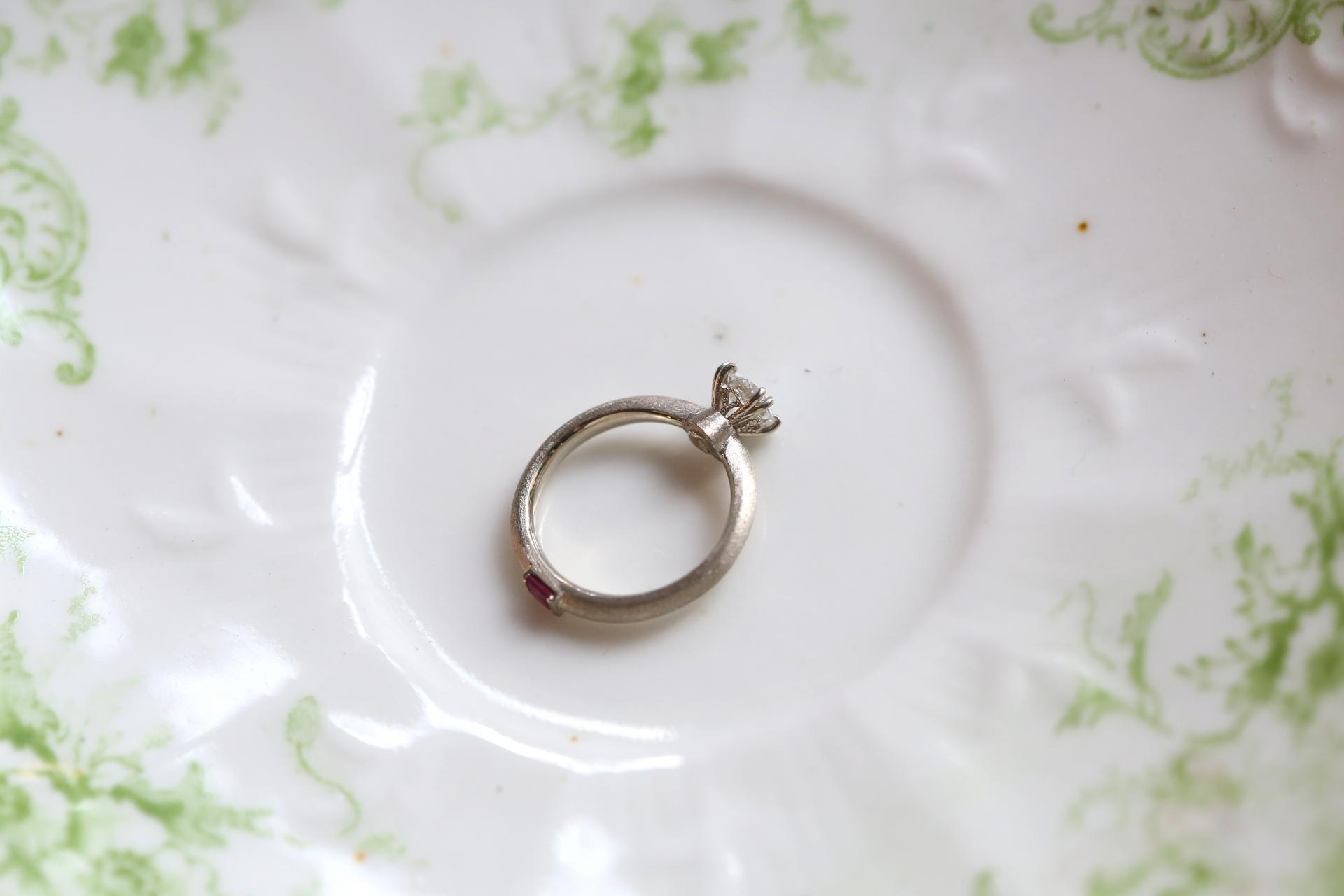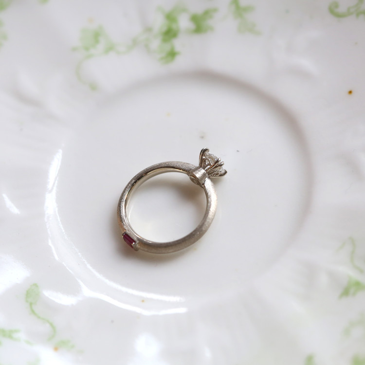 고객님께서 원하신 루비 포인트는 반지 하단에 프린세스 컷으로 심플하게 세팅해 은은한 특별함을 더했습니다.