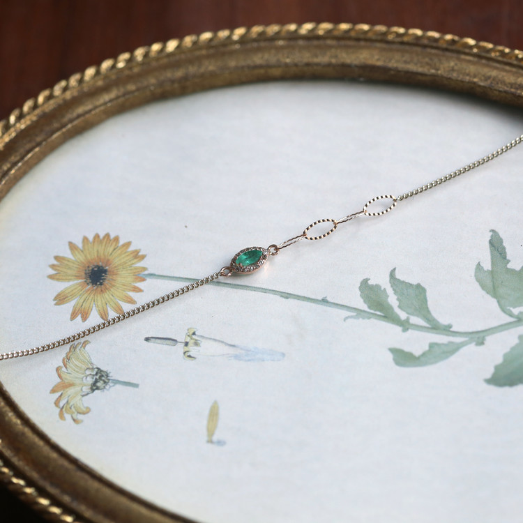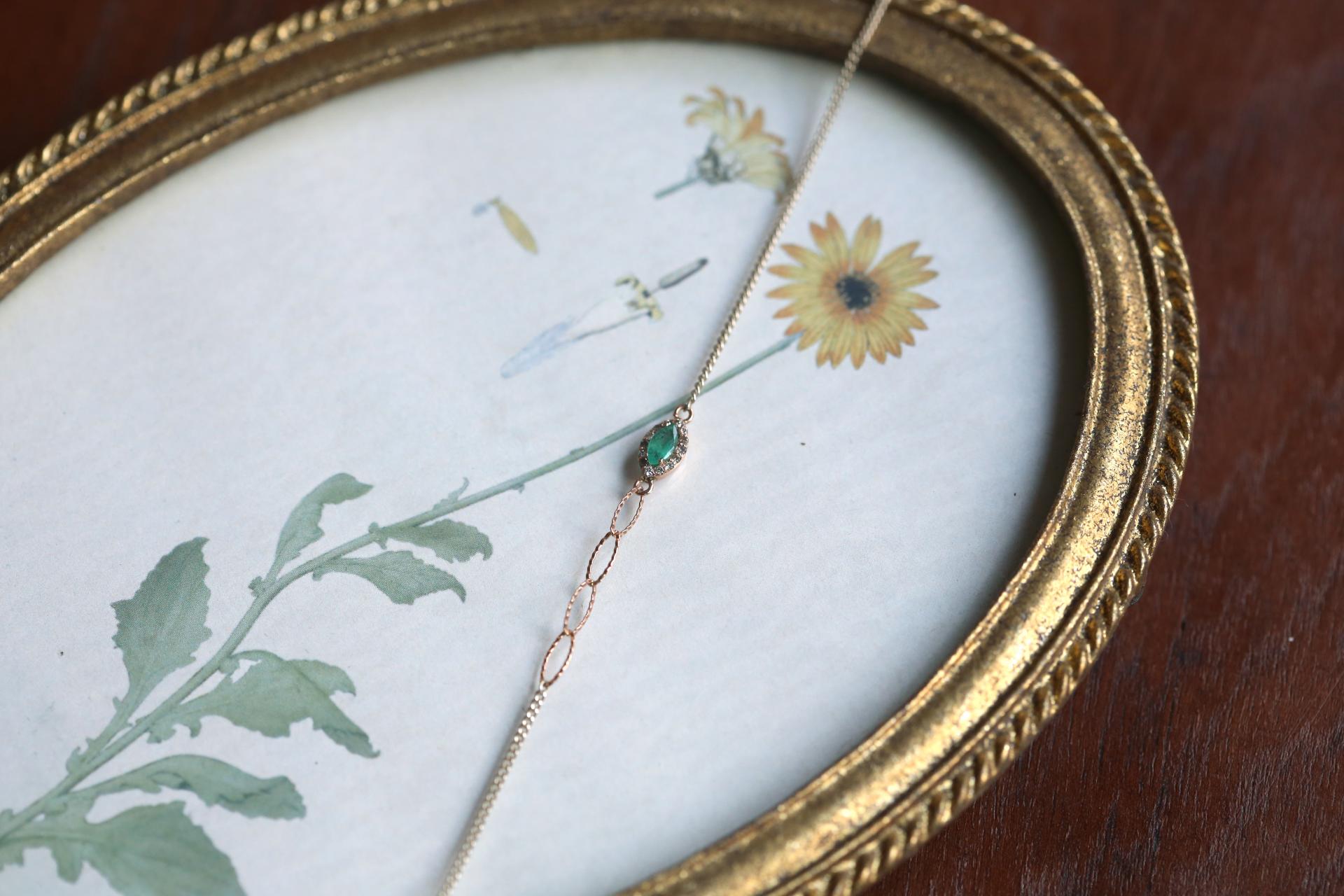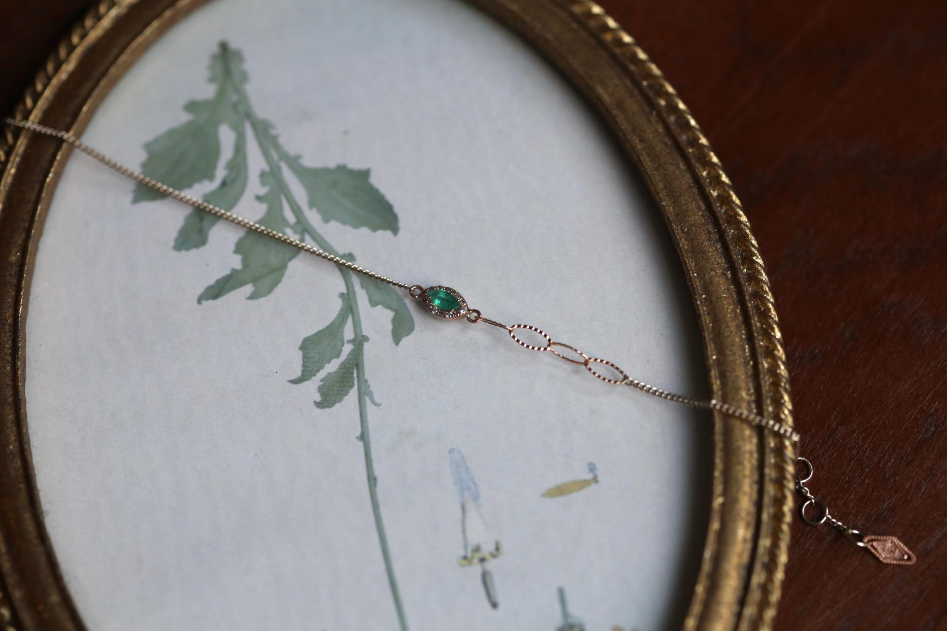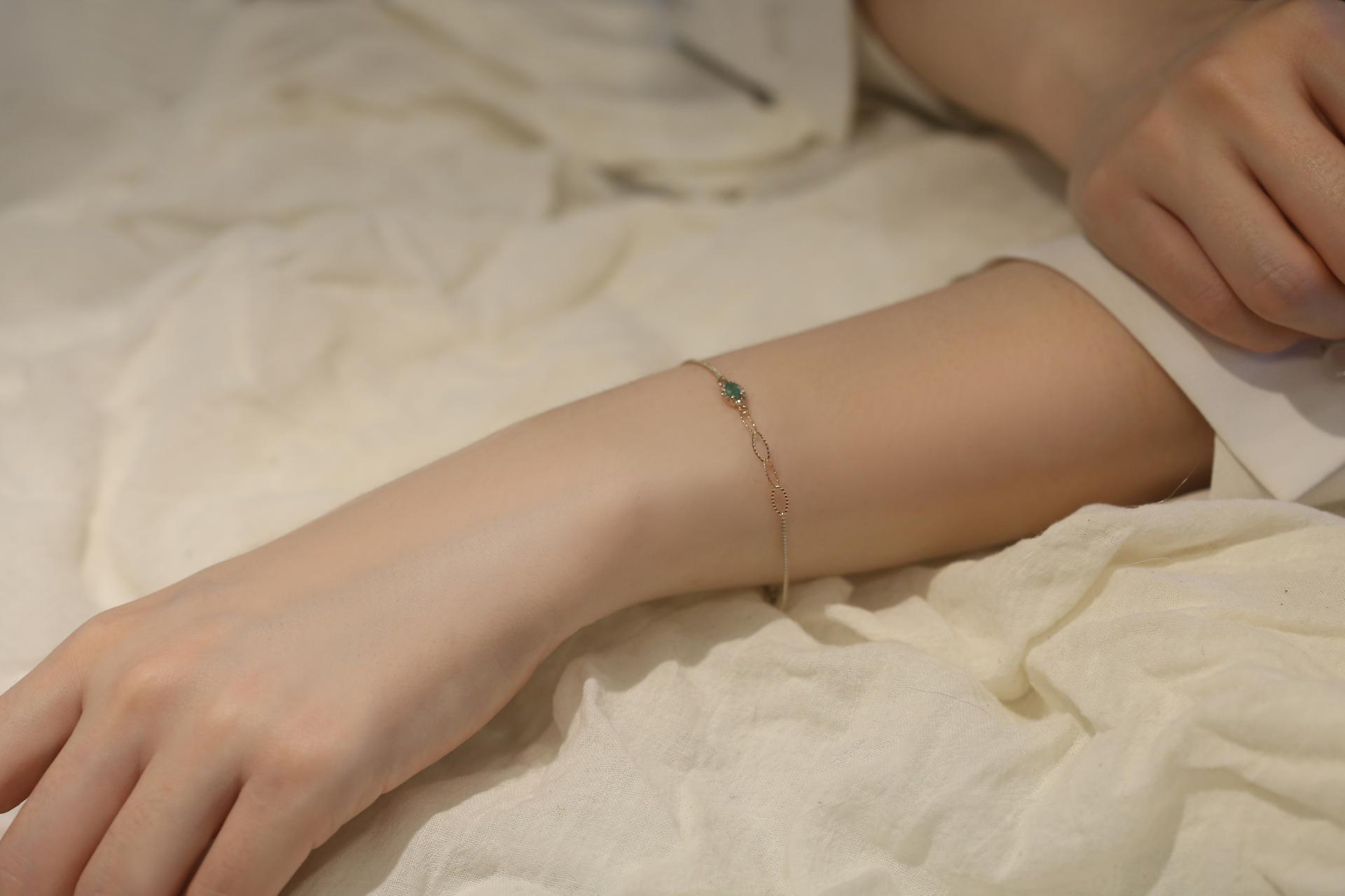 마퀴즈 컷 에메랄드를 중심으로 한 세팅이 손목 위에 우아한 포인트를 더하며,
