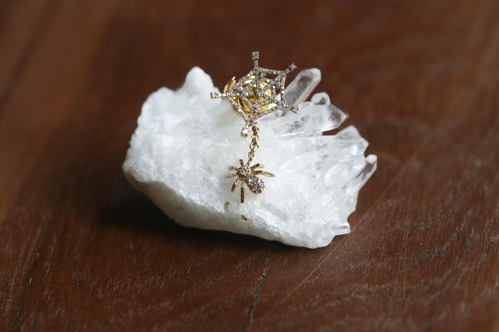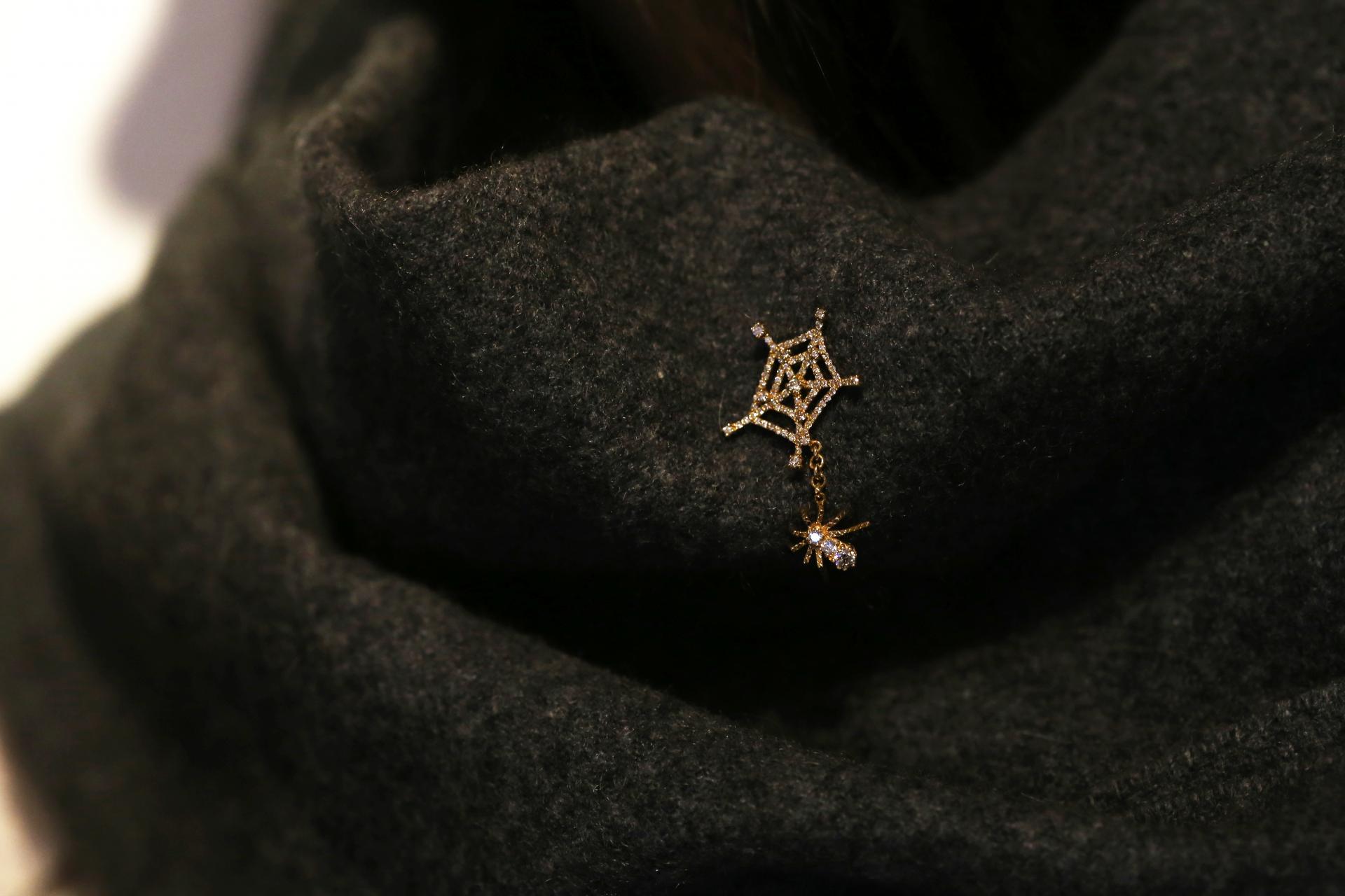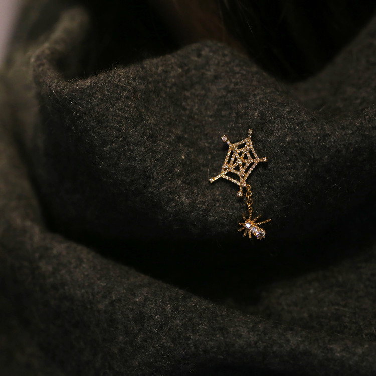 거미줄과 거미가 딸랑이는 위트있는 디자인의 핀 브로치입니다.