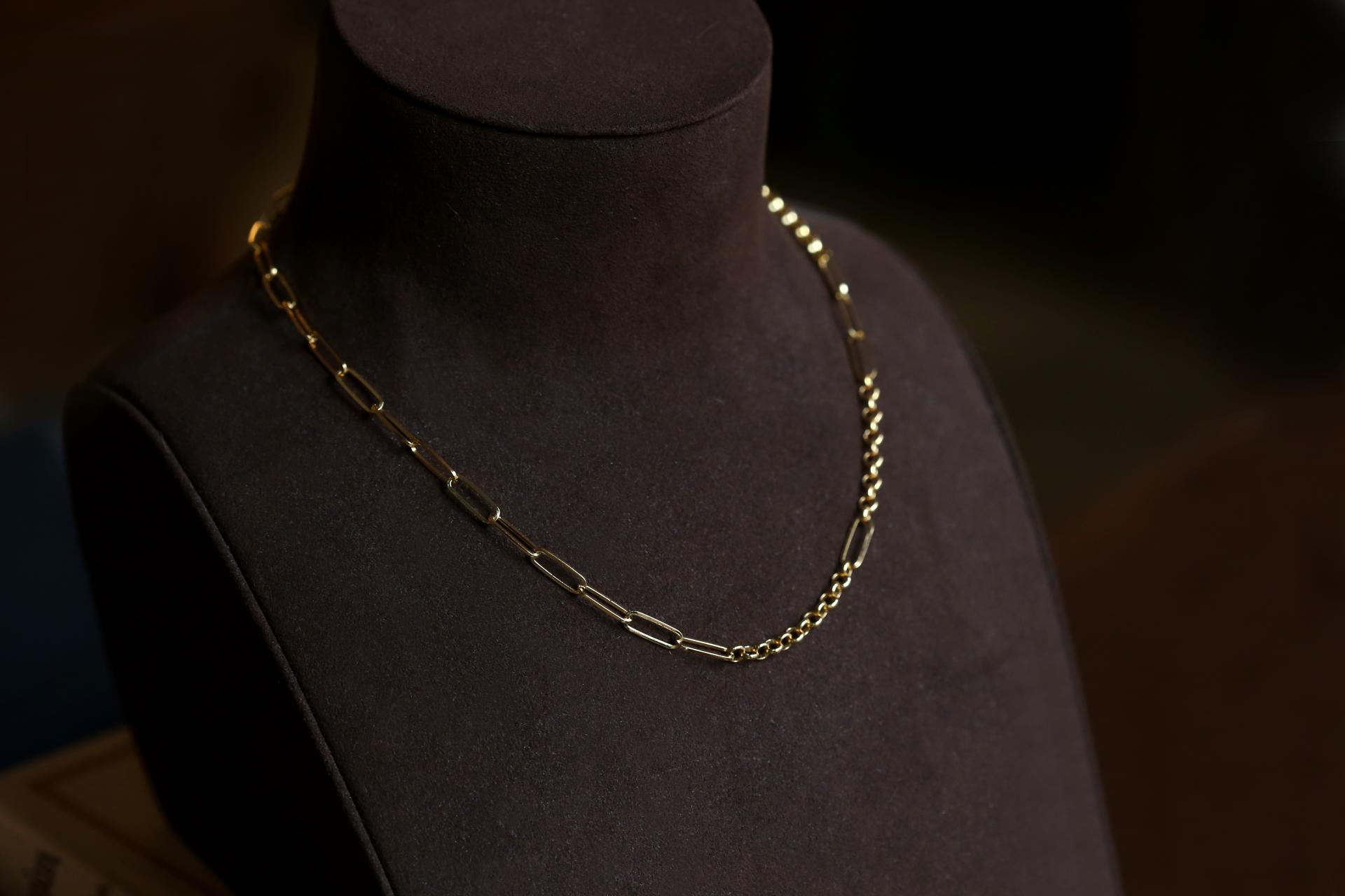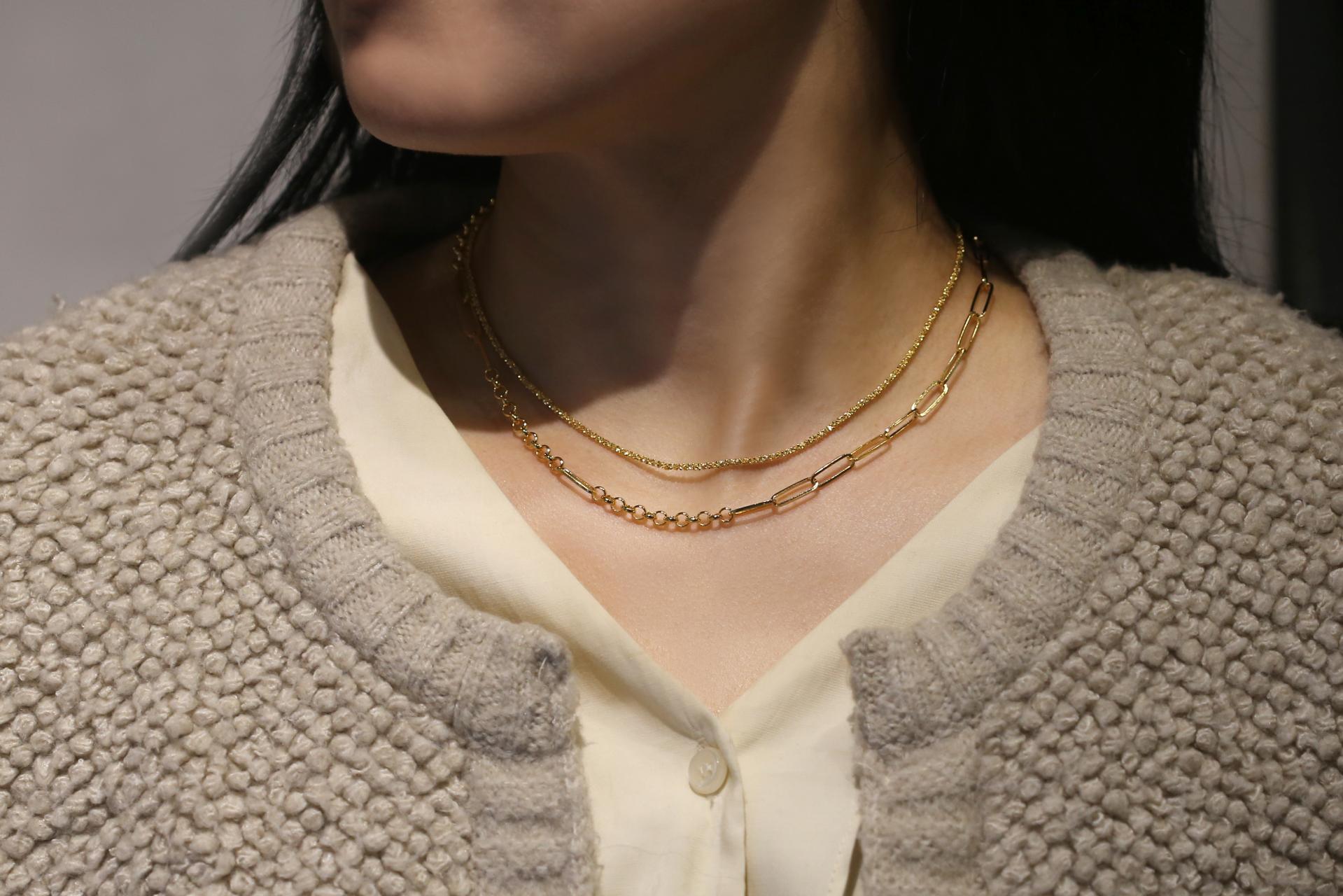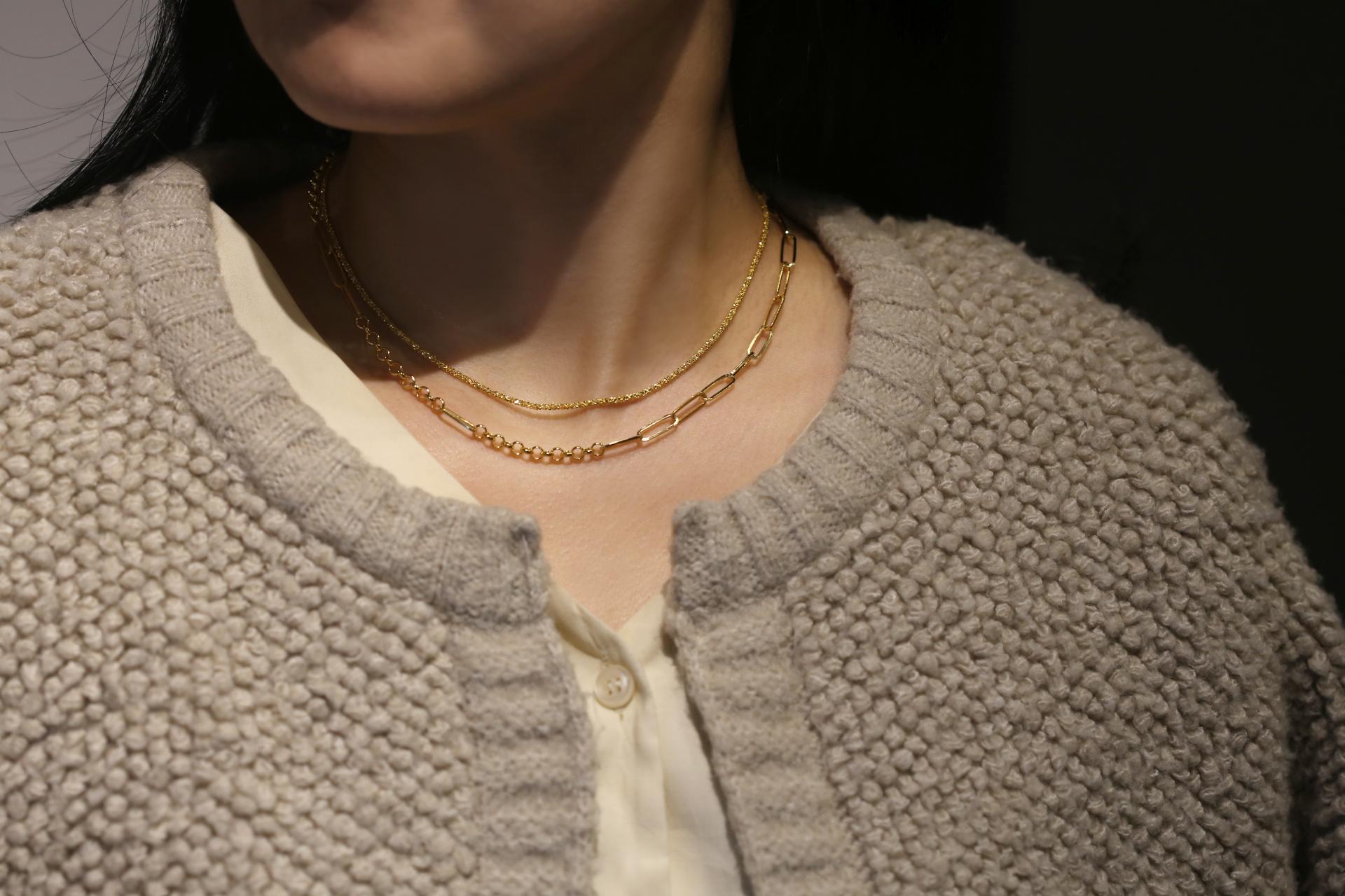 여러 디자인의 체인이 연결되어 볼드하고 세련된 목거이입니다.