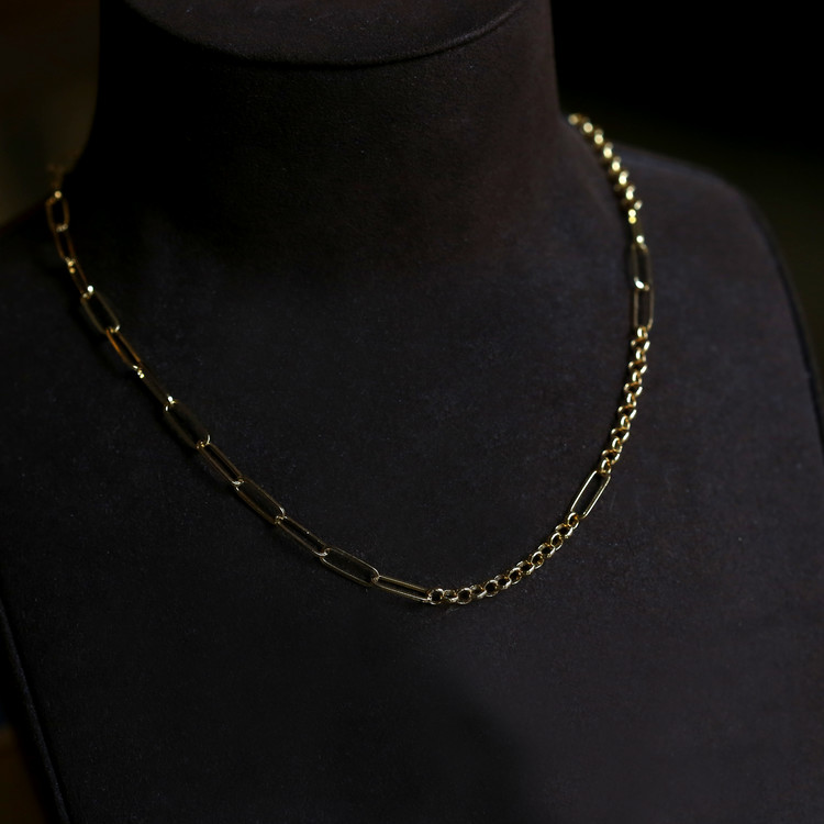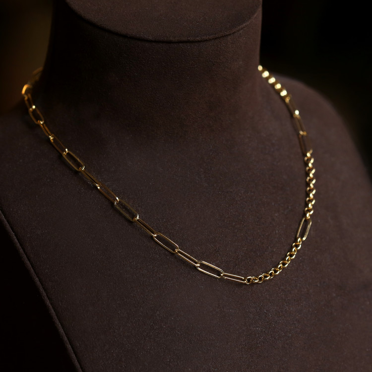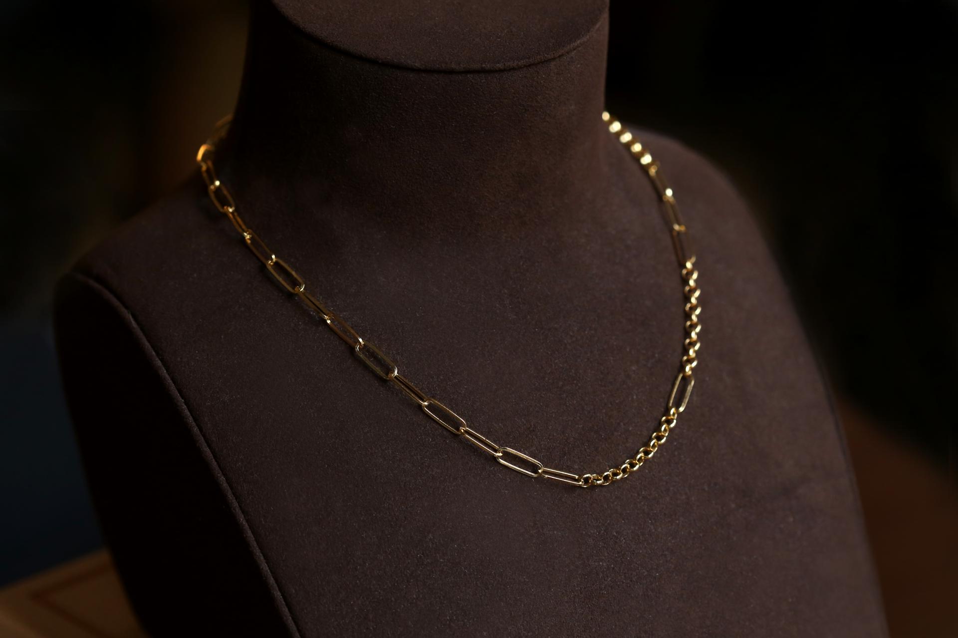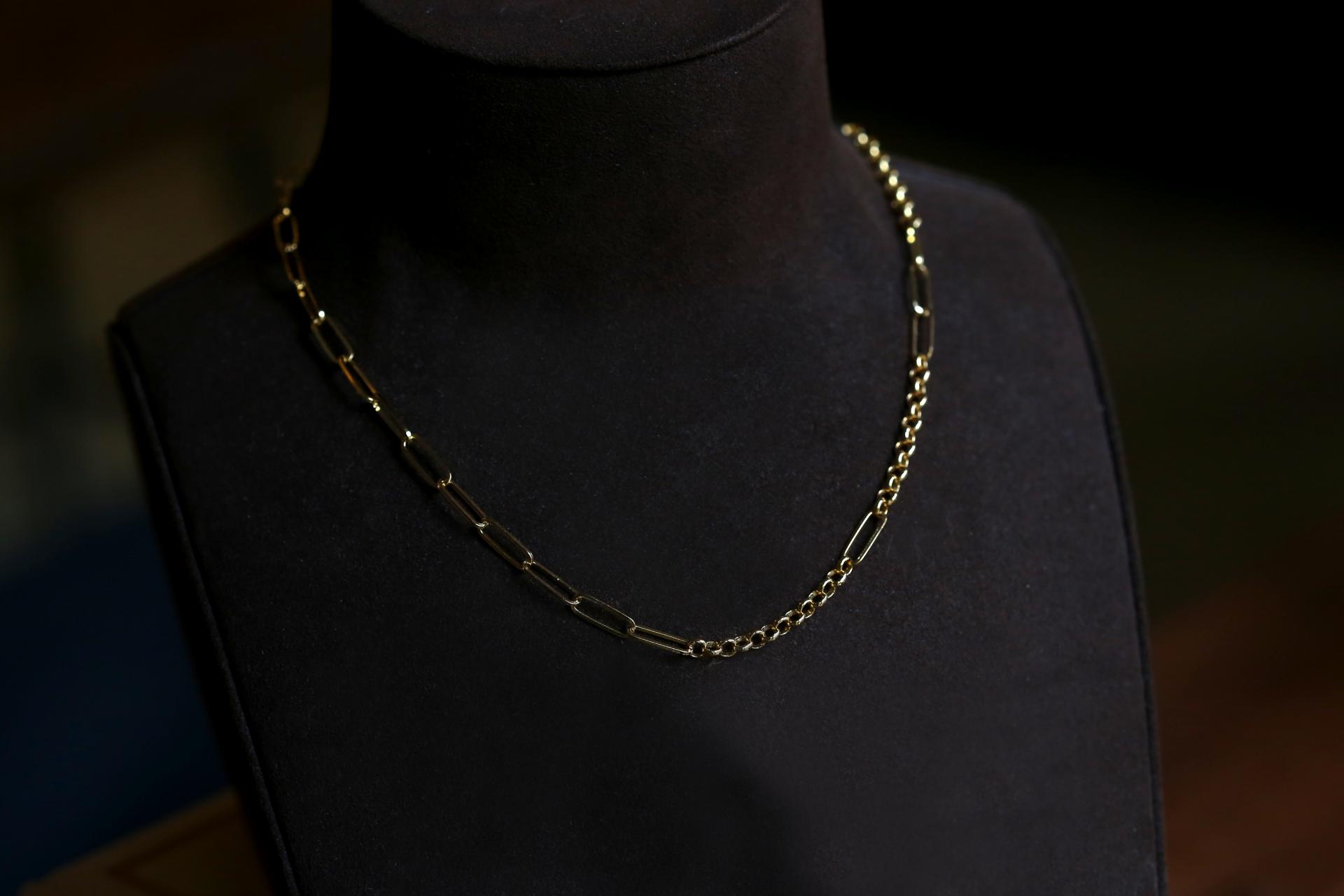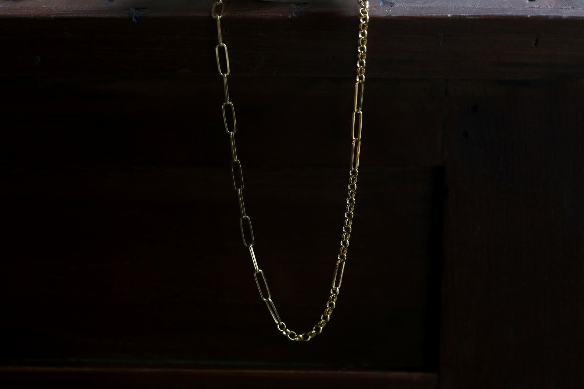 여러 디자인의 체인이 연결되어 볼드하고 세련된 목거이입니다.
